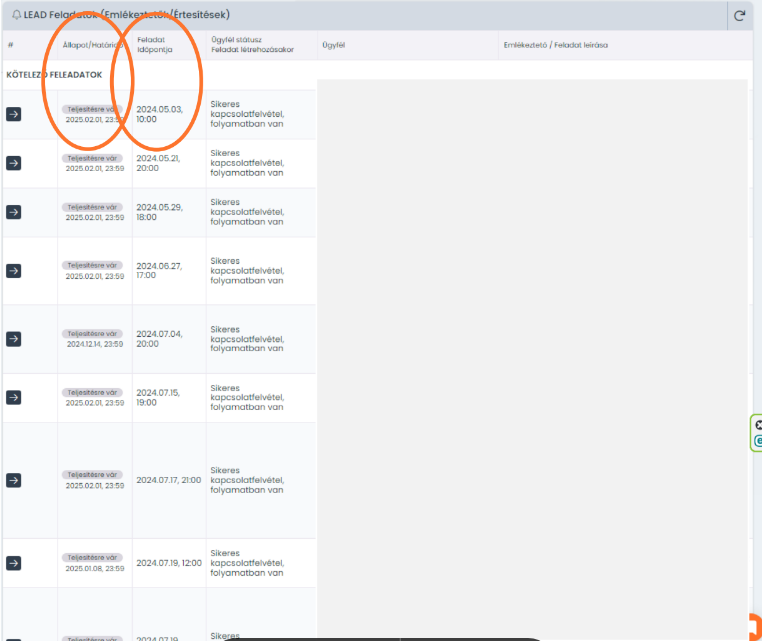Kérjük, hogy a kötelező feladatok lejáratának elkerülése és a minőségi ügyfélkiszolgálás érdekében az ügyfelek megkeresése és a feladatok továbbstátuszolása mindig a Feladat időpontjához (lásd csatolmányban) kapcsolódó dátum alapján történjen meg. Erről a dátumról az ügyfél e-mailben is értesítést kap, amelyben tájékoztatjuk, hogy keresni fogod. Célszerű az egyeztetett időben felvenni vele a kapcsolatot, hiszen ez hozzájárul a bizalom építéséhez. Emellett így biztosítható, hogy a feladatok központi határideje ne járjon le.