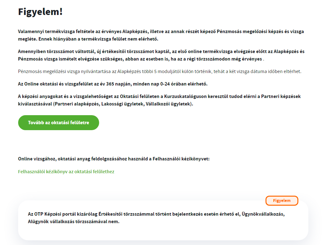 Majd a megnyíló ablakban kicsit lejjebb görgetve a Tovább az oktatási felületre gomb megnyomásával tudsz bejutni az OTP Képzési Portáljára.