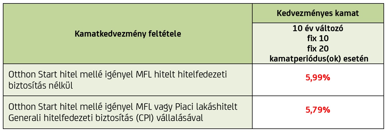 Amennyiben az ügyfél Otthon Start lakásvásárlási hitel mellé egyidejűleg MFL vagy Piaci lakáshitelt igényel, a piaci lakáshitelek kamatából - mind ügynöki, mind ügyfél által fiókban benyújtott hitelkérelmek esetén – további kamatkedvezményt biztosítunk az alábbi feltételekkel: