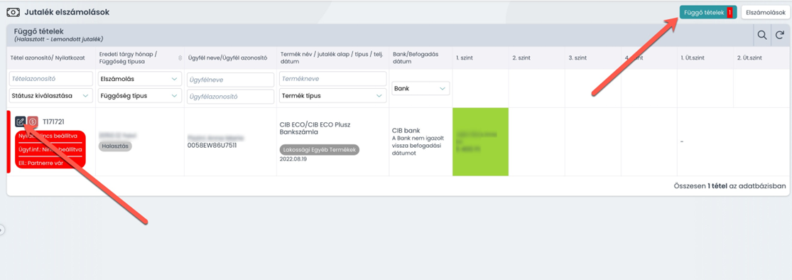 - Amennyiben az ügyéltájékoztatás igazolása (pl. papír alapon) több időt vesz igénybe, akkor az érintett tételeket függő listára lehet tenni, tehát kikerül az adott havi elszámolásból, így nem akad meg a teljes jutalékkifizetés. A tétel később a függő listáról bármikor visszahelyezhető a következő elszámolásba.
