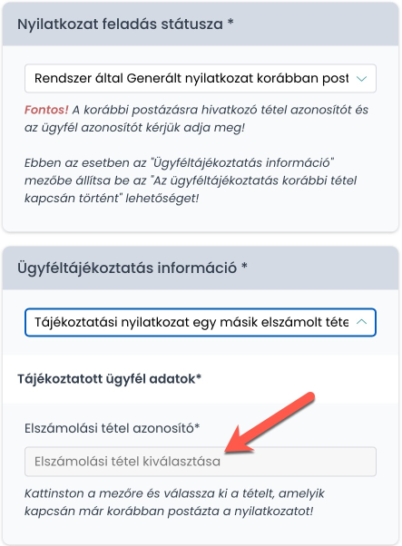 Amennyiben a tájékoztatási nyilatkozat korábban már elküldésre került, akkor itt tudod jelölni, hogy melyik elszámolás tételhez lett a központi kollégáinknak elküldve.